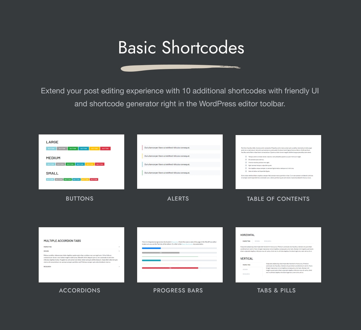 Extend your post editing experience with 10 additional shortcodes with friendly UI and shortcode generator right in the WordPress editor toolbar: vertical and horizontal tabs and pills, accordions, separators, buttons, progress bars and others.