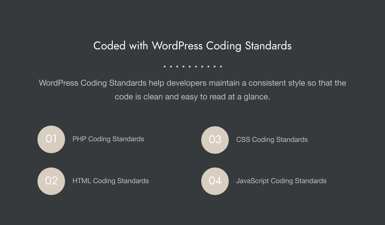 WordPress Coding Standards help developers maintain a consistent style so that the code is clean and easy to read at a glance. We keep it in mind when writing code for our WordPress themes.