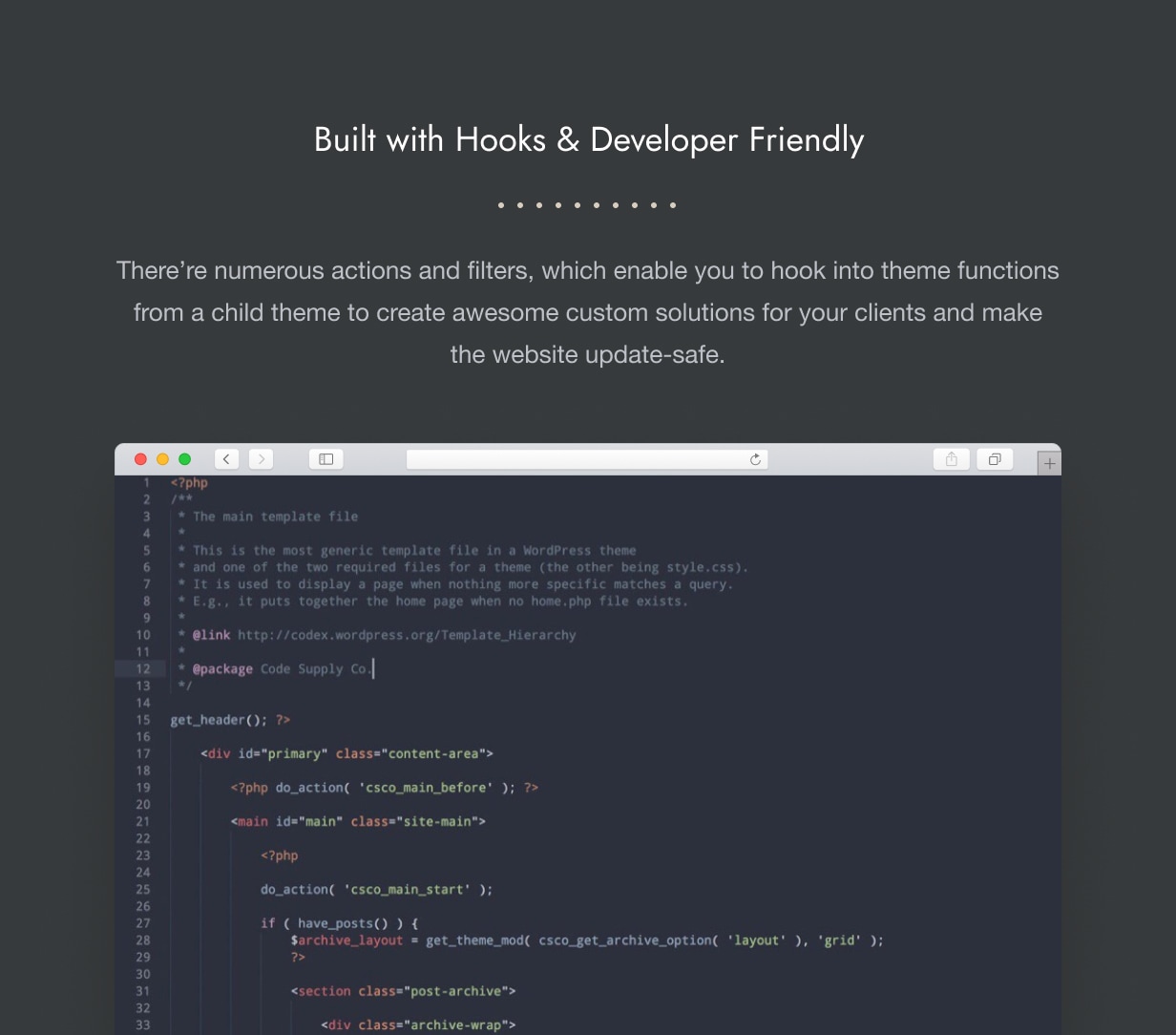There’re numerous actions and filters, which enable you to hook into theme functions from a child theme to create awesome custom solutions for your clients and make the website update-safe.