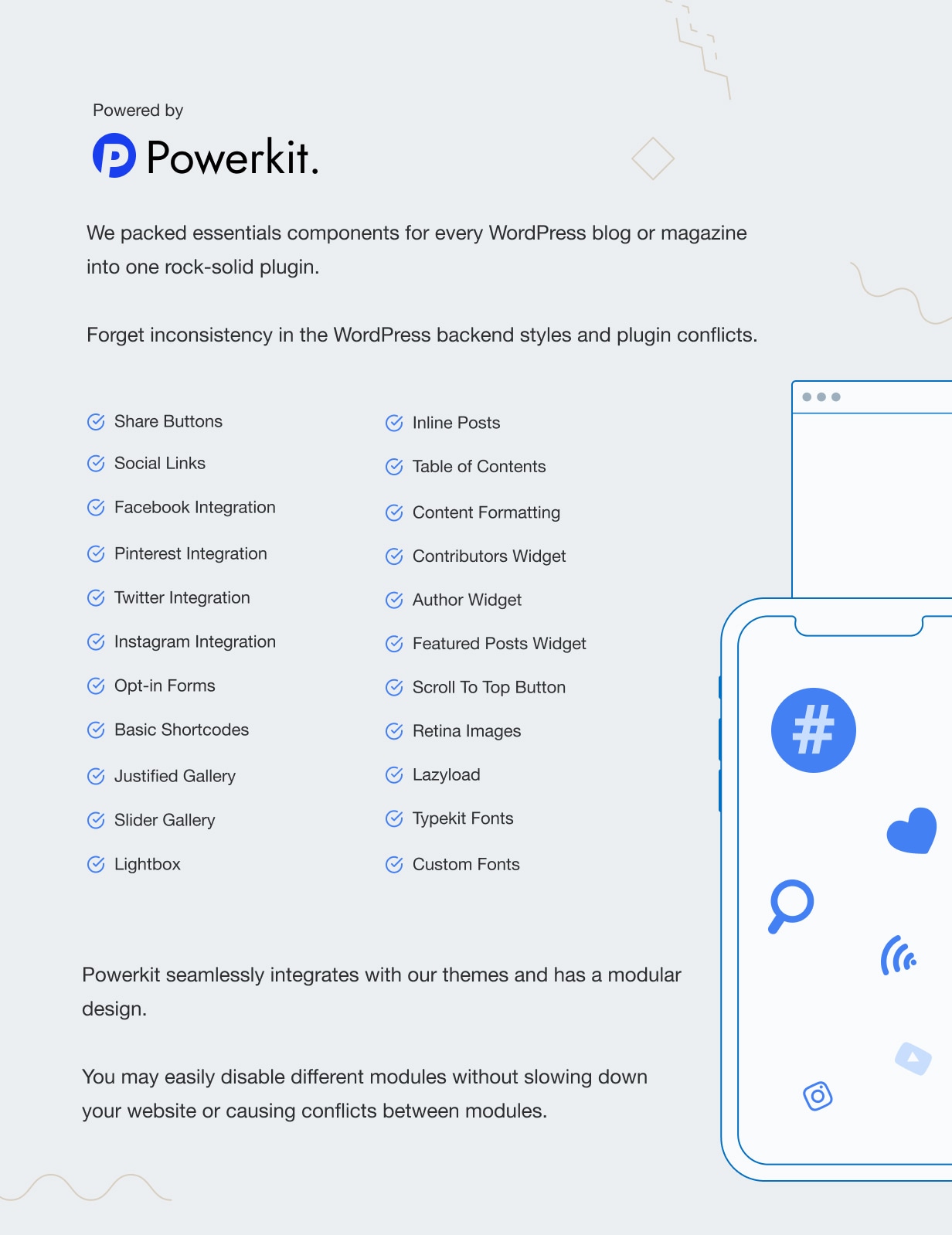 Powerkit is our in-house plugin for extending our theme features. You don’t need to search for compatible plugins for all the basic components of your website: share buttons, social links, author and about widgets, newsletter opt-in forms, slider and tiled galleries, lightbox, lazy load of images and other great features that every blog or magazine needs. Powerkit seamlessly integrates with our themes in terms of features and site appearance. It has a modular design and you may easily disable different modules without slowing down your website.
