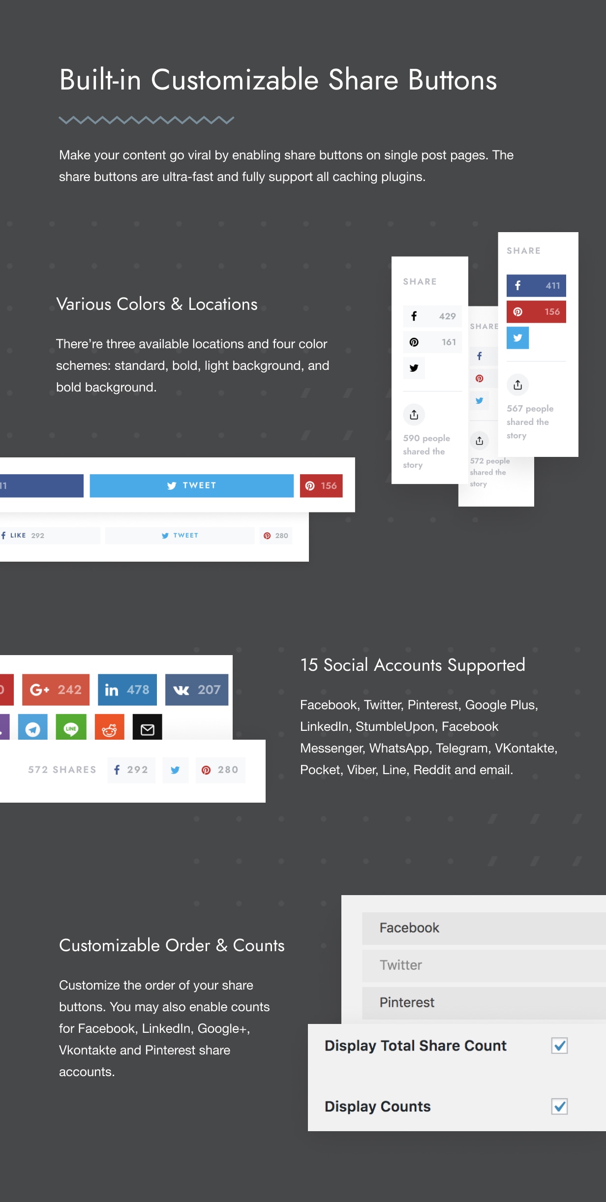 Choose between 15 social accounts: Facebook, Twitter, Pinterest, Google Plus, LinkedIn, StumbleUpon, Facebook Messenger, WhatsApp, Telegram, VKontakte, and email.