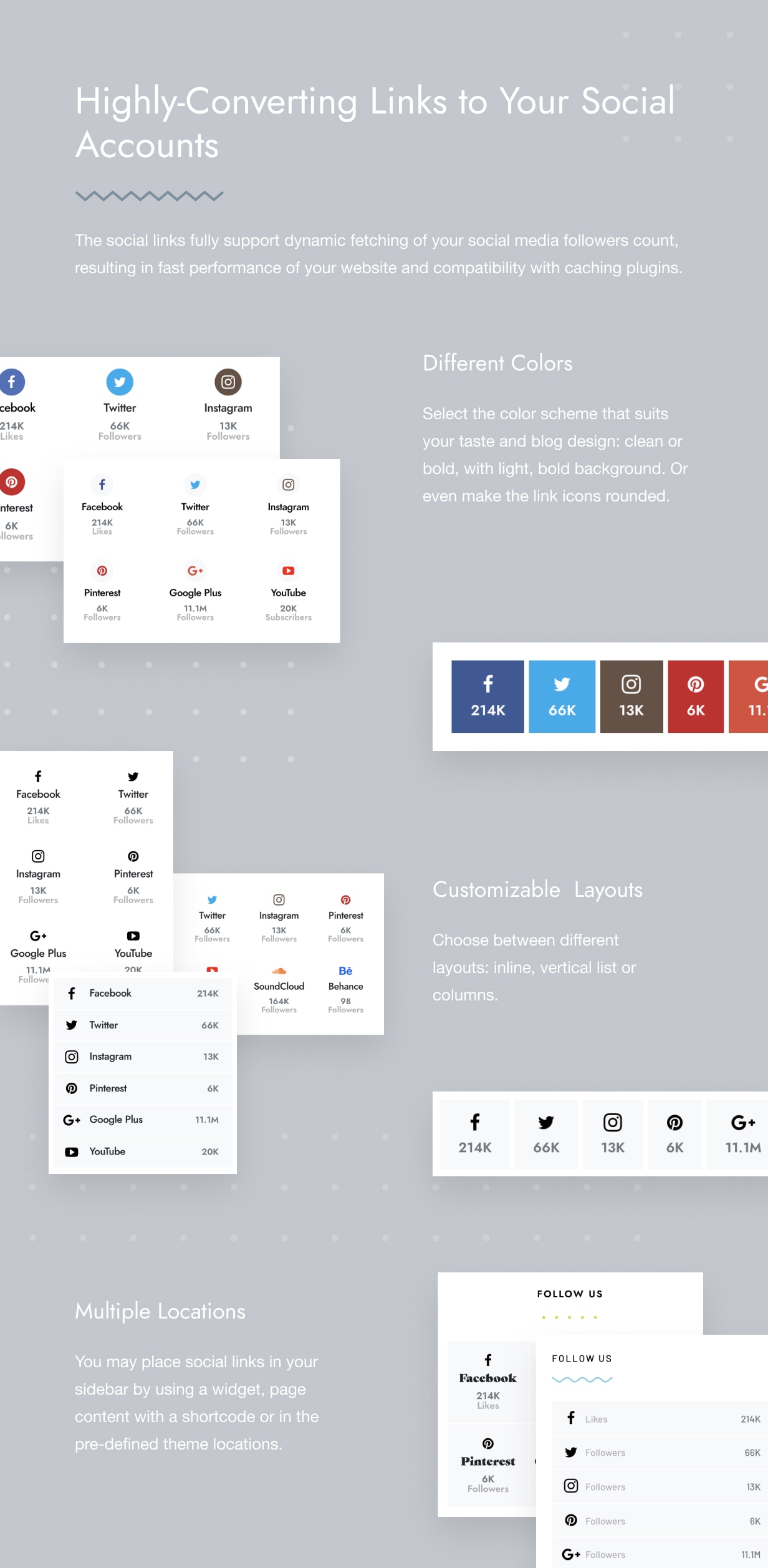 Just as the share buttons, the social accounts fully support dynamic fetching of your social media followers count, resulting in fast performance of your website and compatibility with caching plugins.